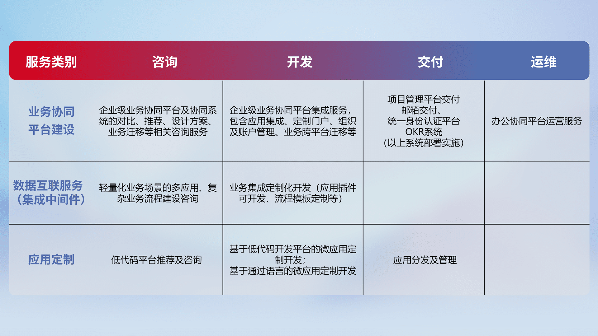 针对钉钉、、、企微、、、IDaas等平台级产品提供产品的规划、、、、方案、、交付、、定制化开发等服务,,实现如统一协同办公、、、智能客户服务、、混合会议管理、、、智能数据查询、、、、等业务场景,,,,实现数字化转型。。。
